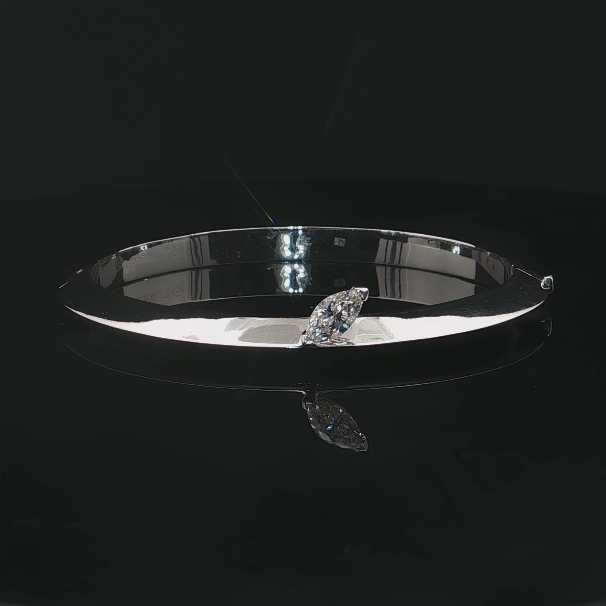 This bangle is featuring a wide, flattened band crafted in white gold.A single marquise diamond is delicately set at the top ,it appears to be set in a way that makes it seem as though it is floating, the slim yet structured shape gives it a bold yet making it a versatile piece that can be worn alone for a minimalist look or stacked for a more dramatic effect.