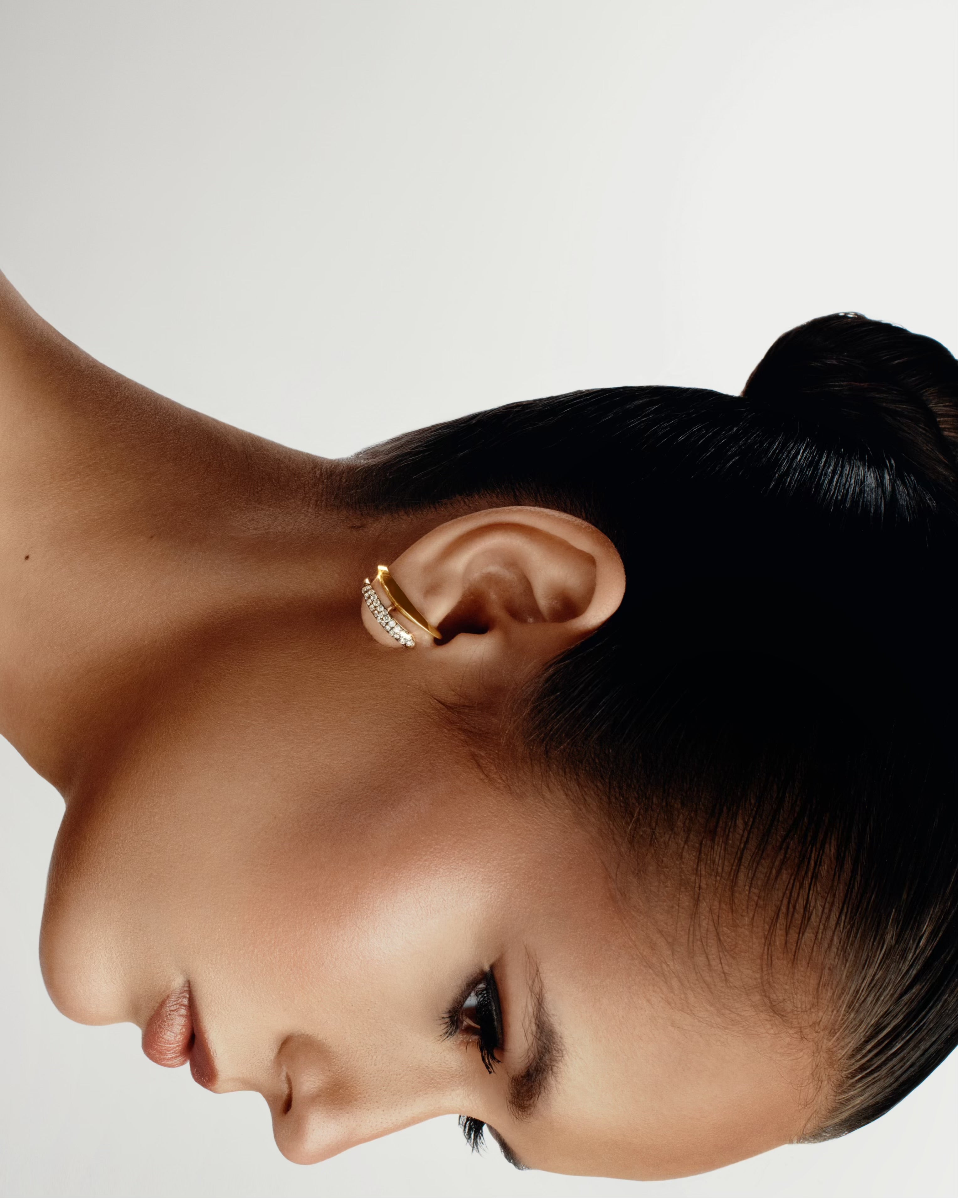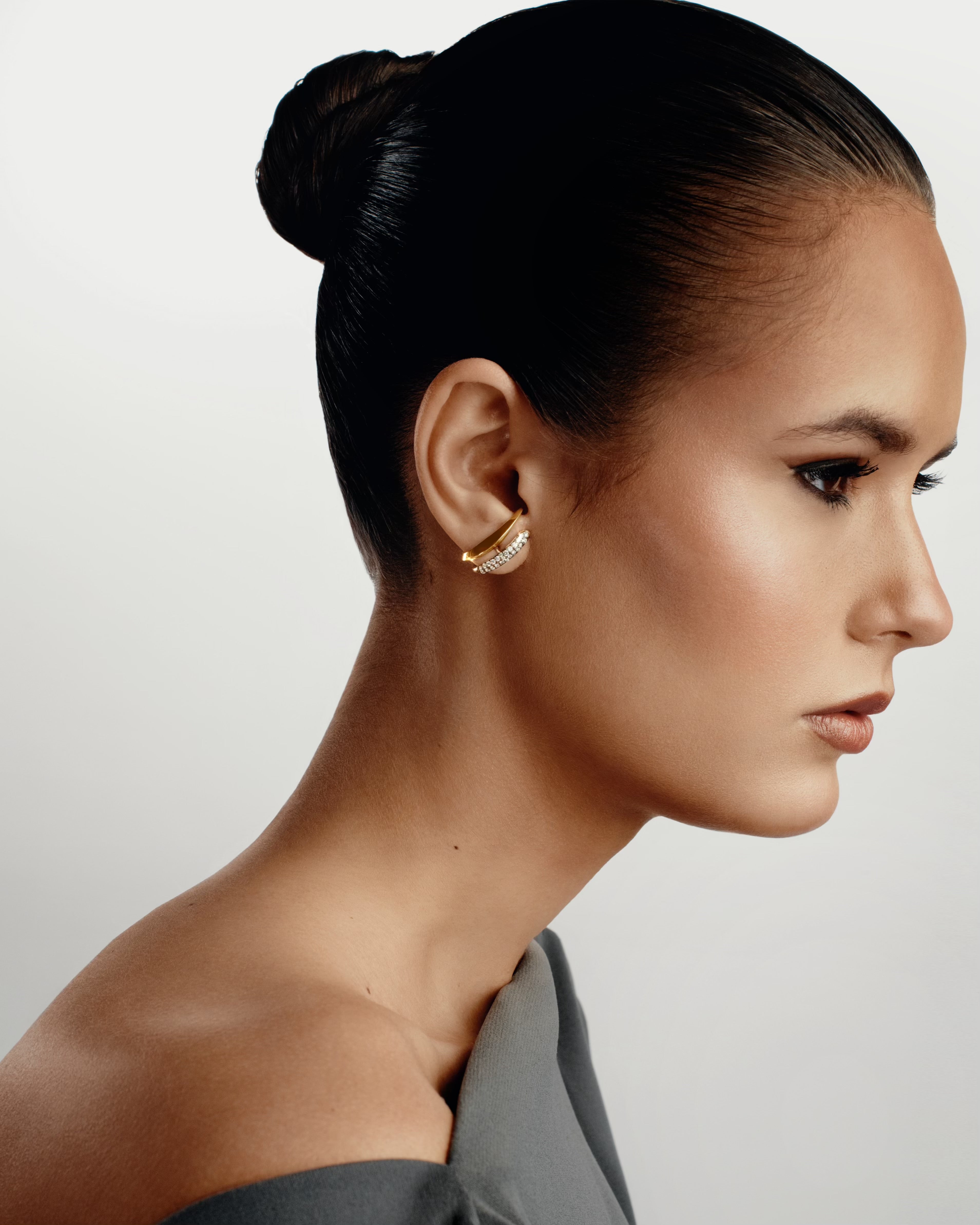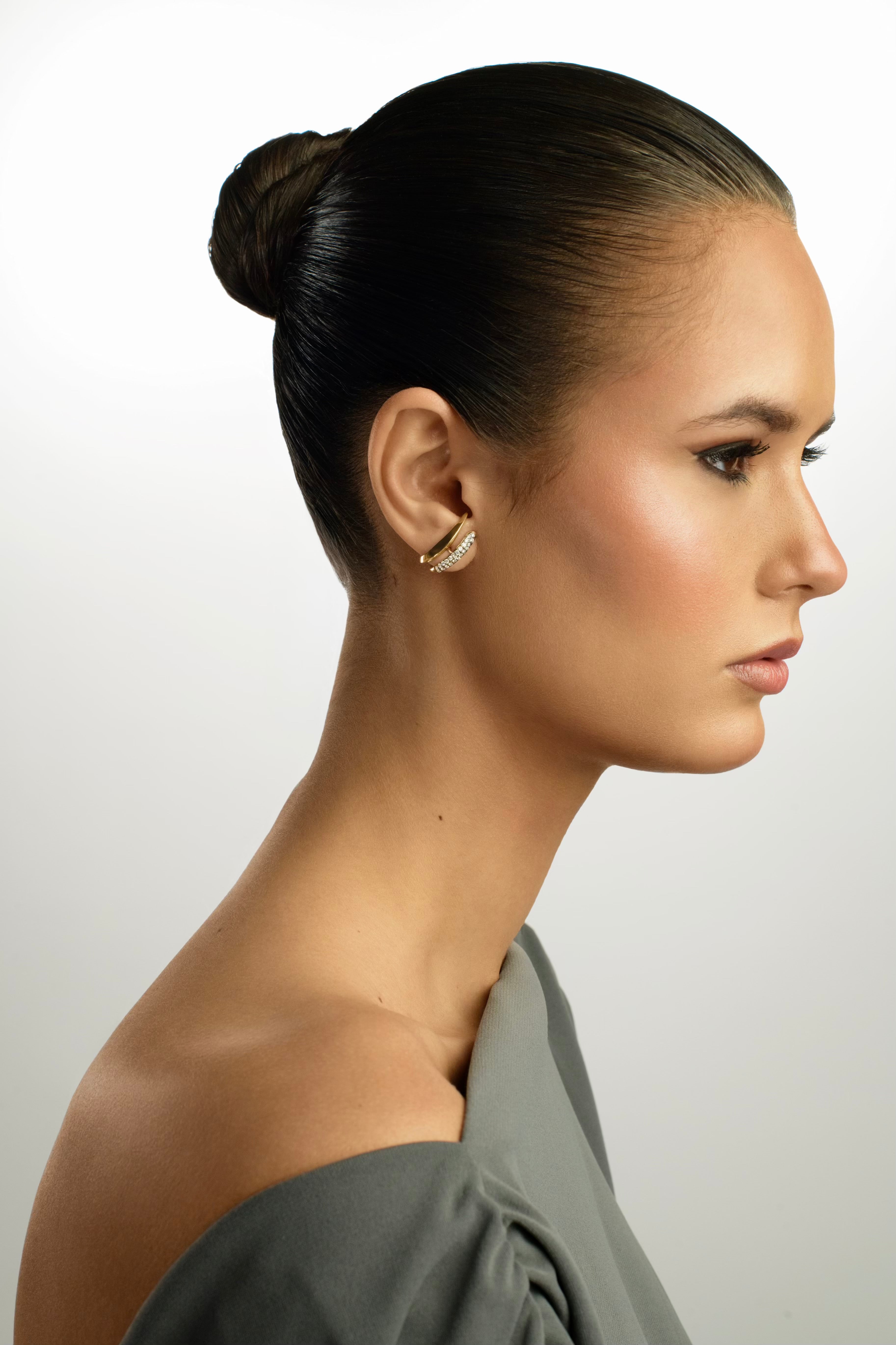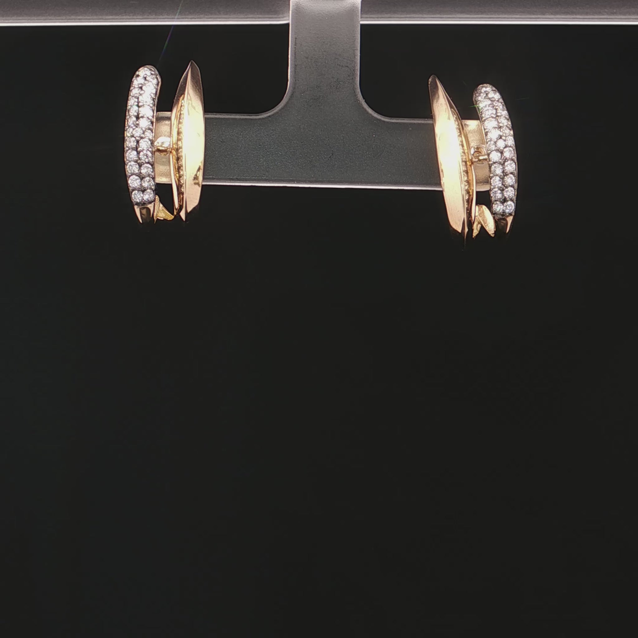 These earrings are crafted in 18k yellow gold. The design features a double curved form: one arc in plain rose gold, paired with a second arc fully set in pavé round diamonds.