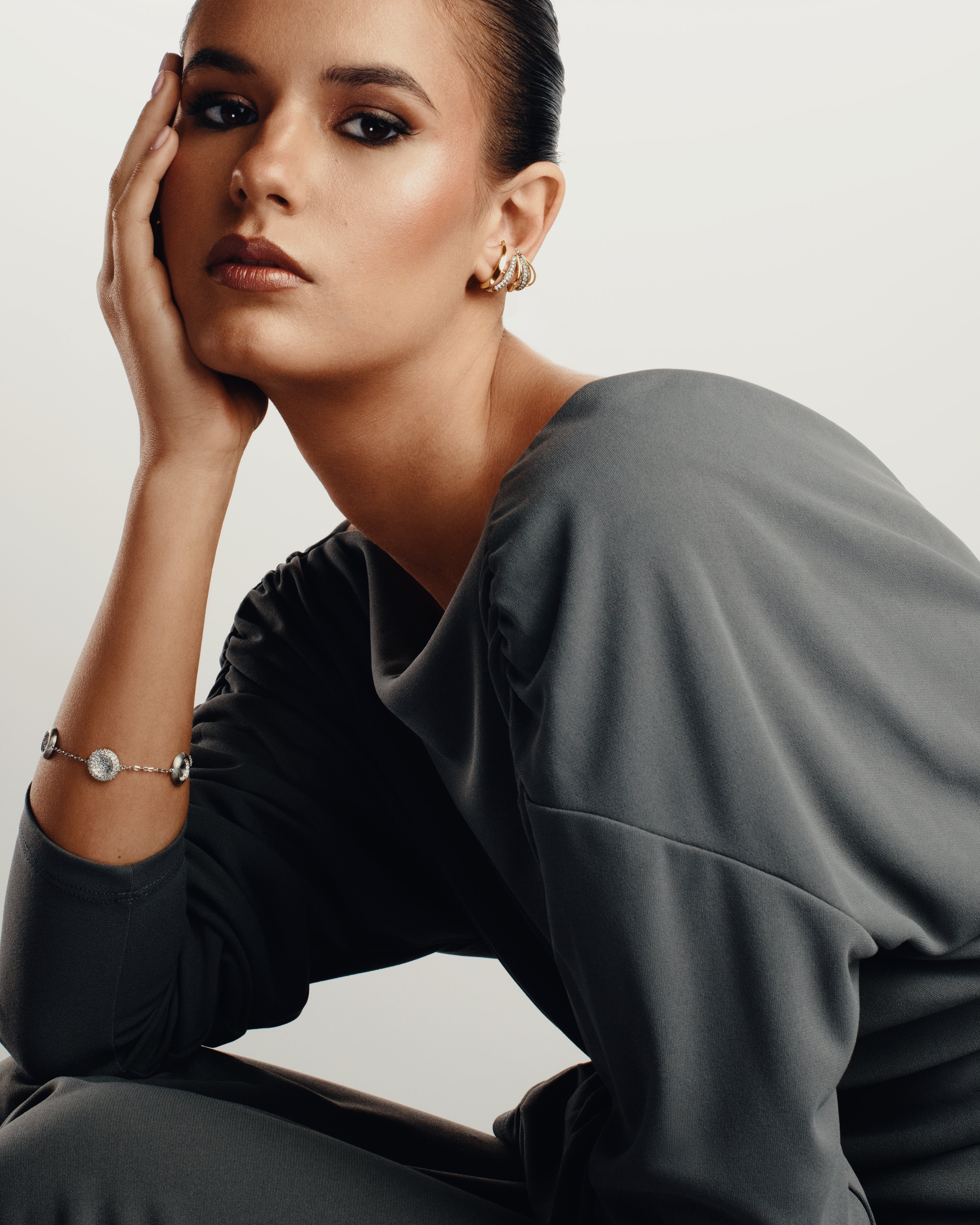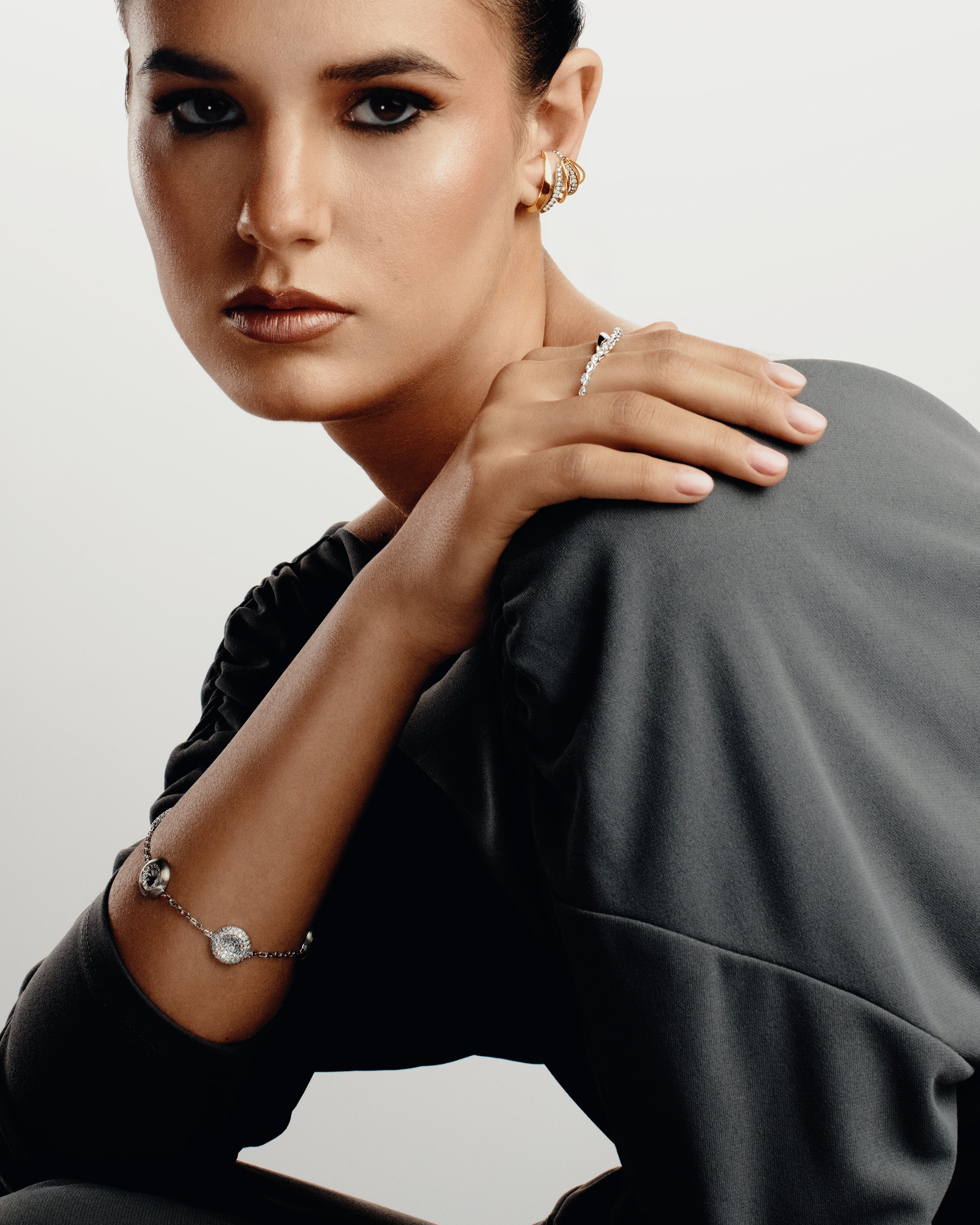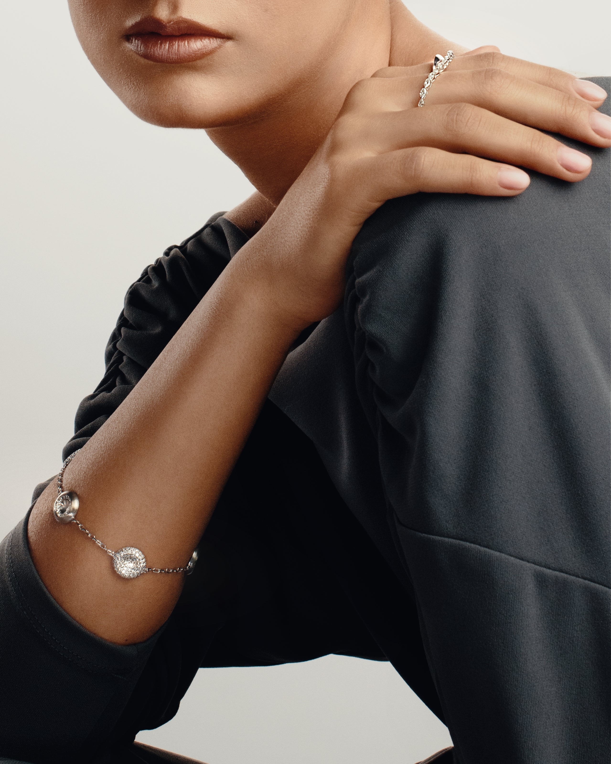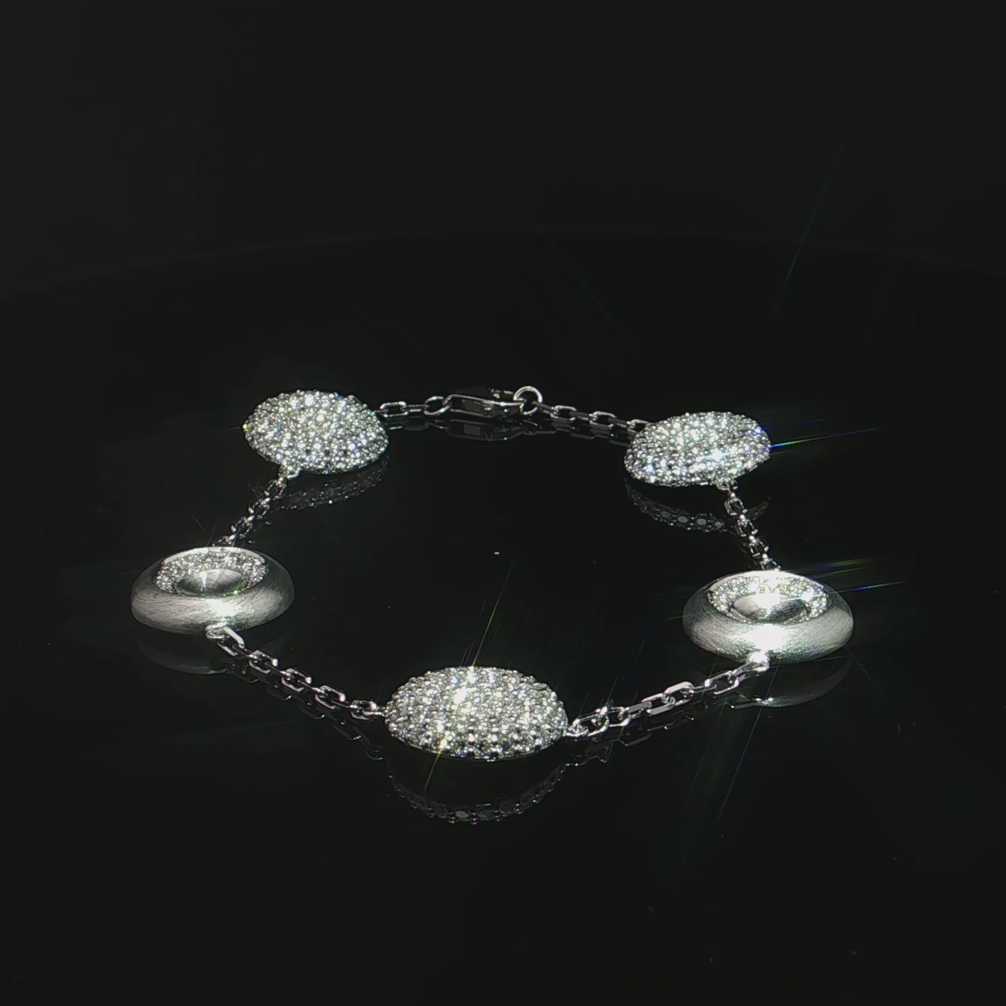 This bracelet is crafted in 18k white gold, featuring a series of round sculptural links connected by a delicate chain. The design alternates between two styles: polished dome-like discs with a smooth center and discs fully encrusted with pavé-set white diamonds.