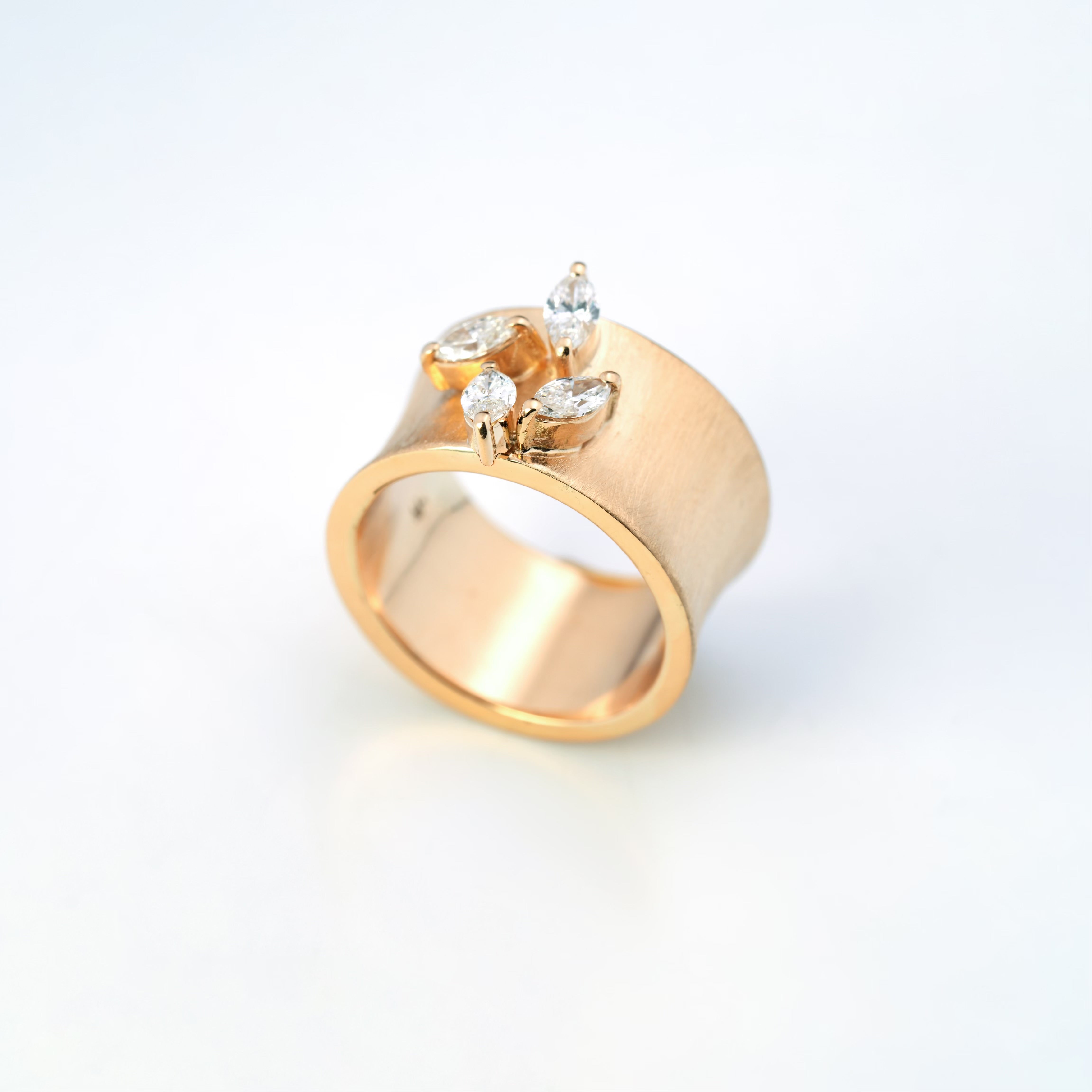 This bold ring is crafted in 18k yellow matte gold with a wide, flat band that showcases a refined brushed finish. The surface is accented with a cluster of marquise-cut white diamonds, delicately set in prongs to enhance their natural sparkle.