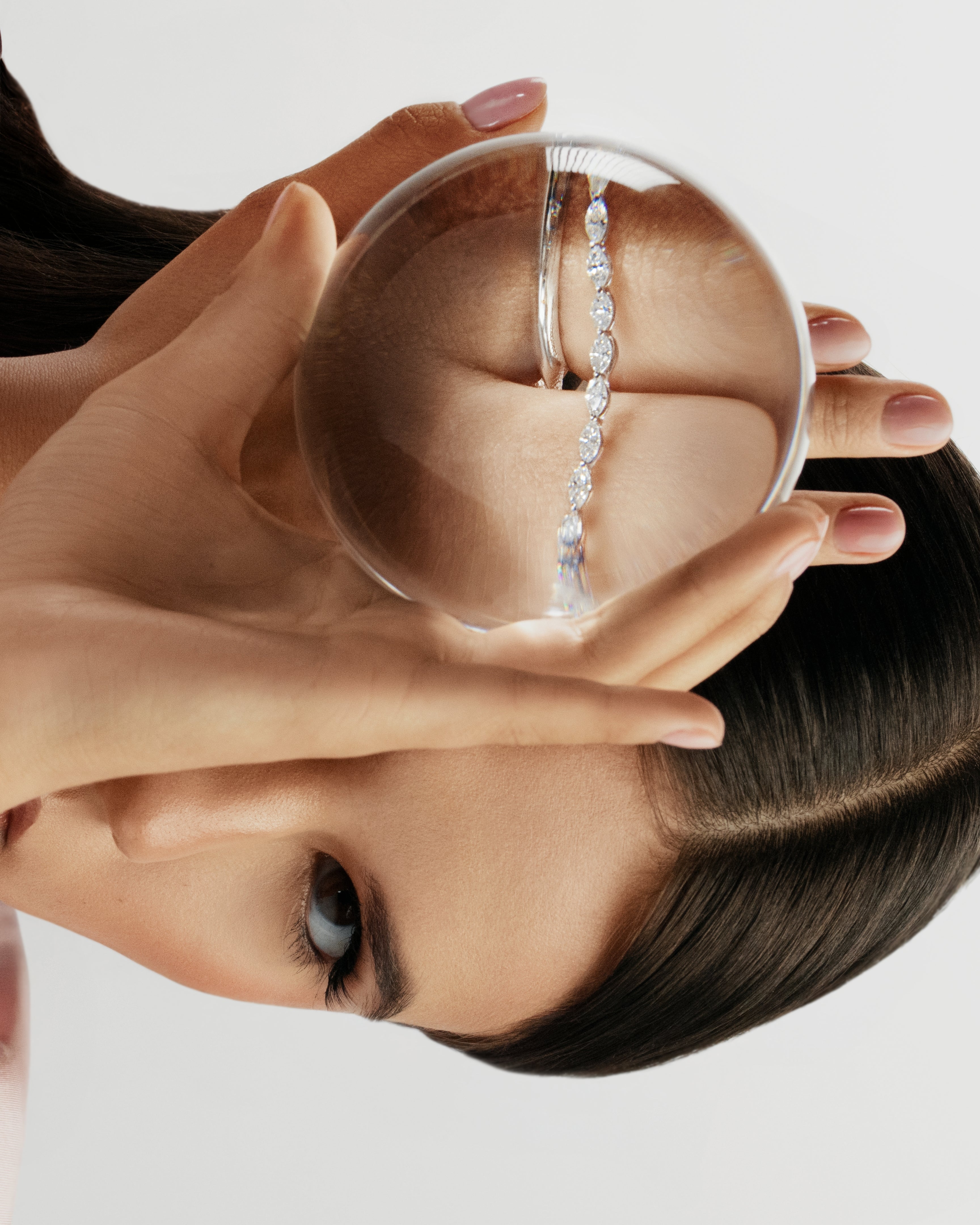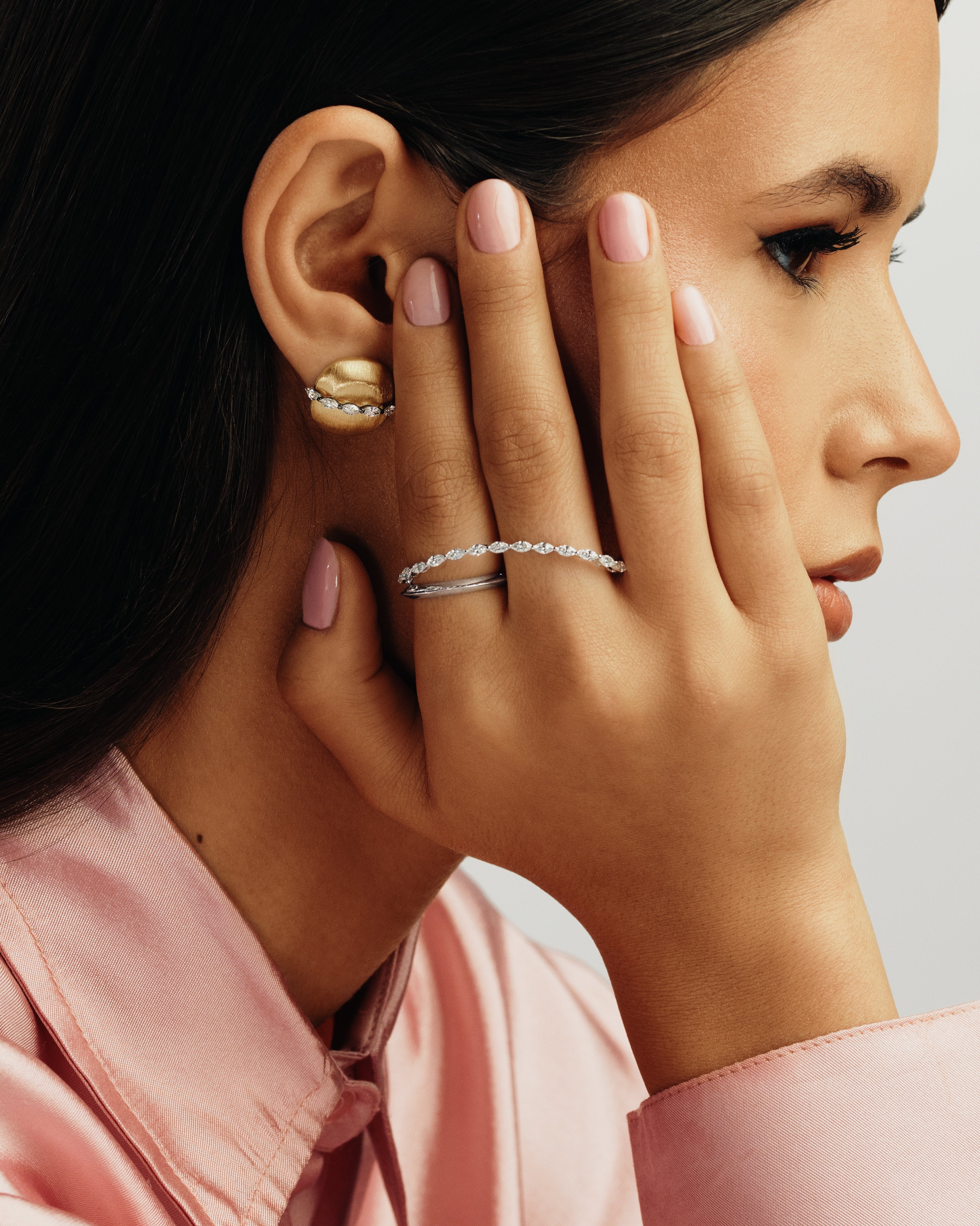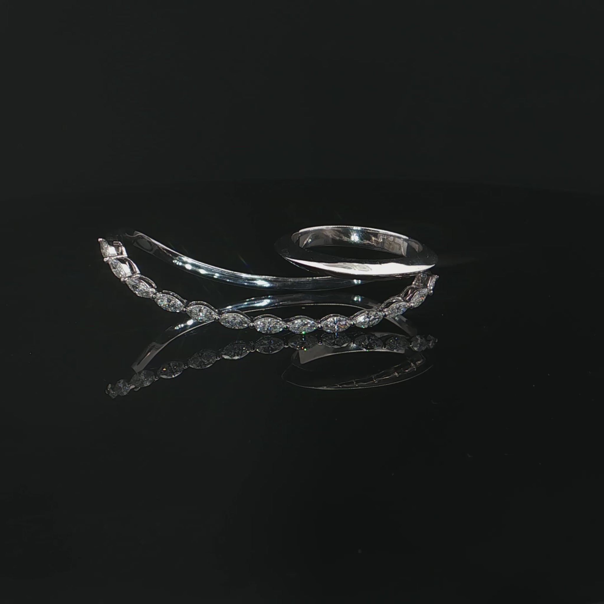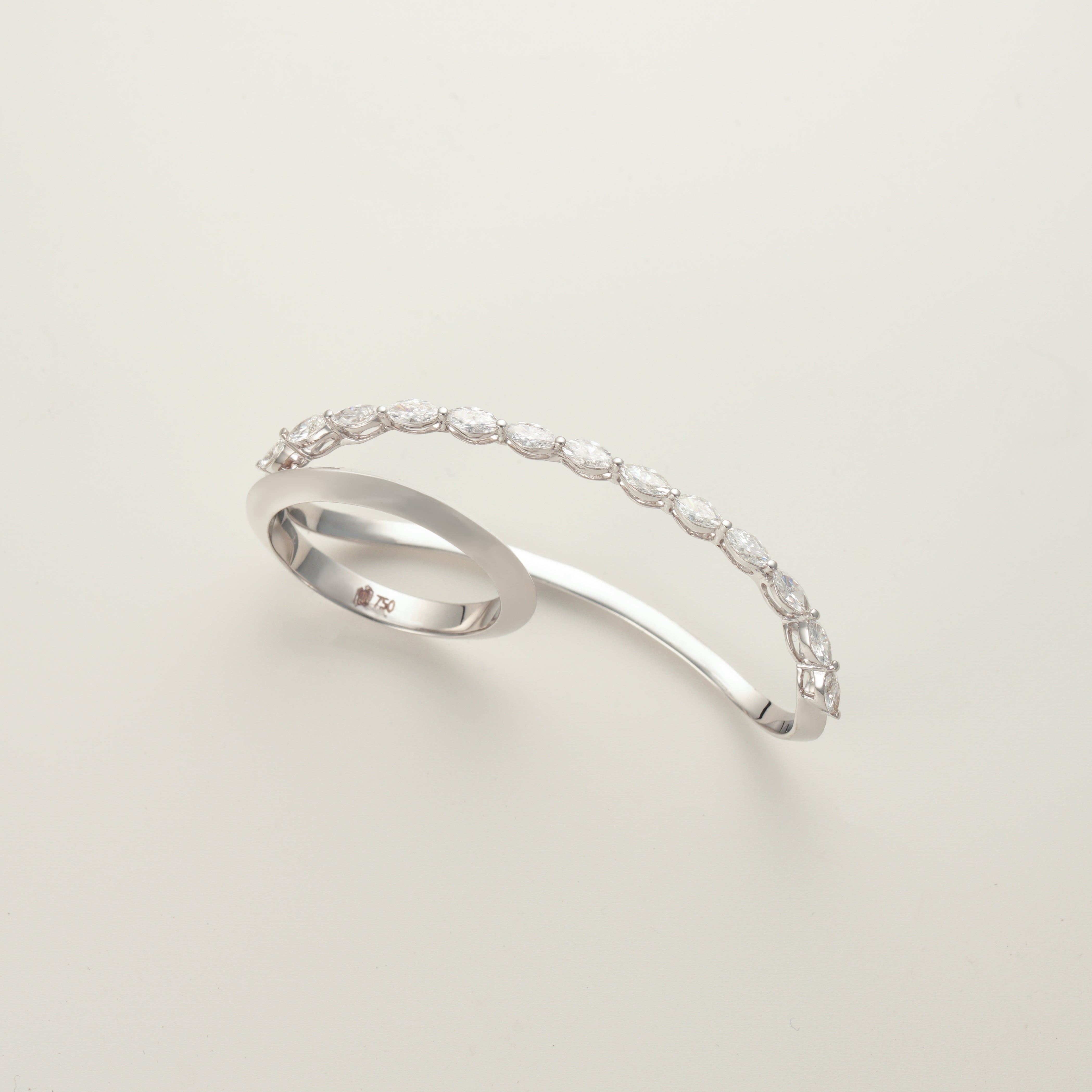This is a wide statement ring crafted in 18k white gold with a smooth, polished. Across the top of the band runs a delicate arc of marquise-cut white diamonds, arranged side by side in a continuous line.