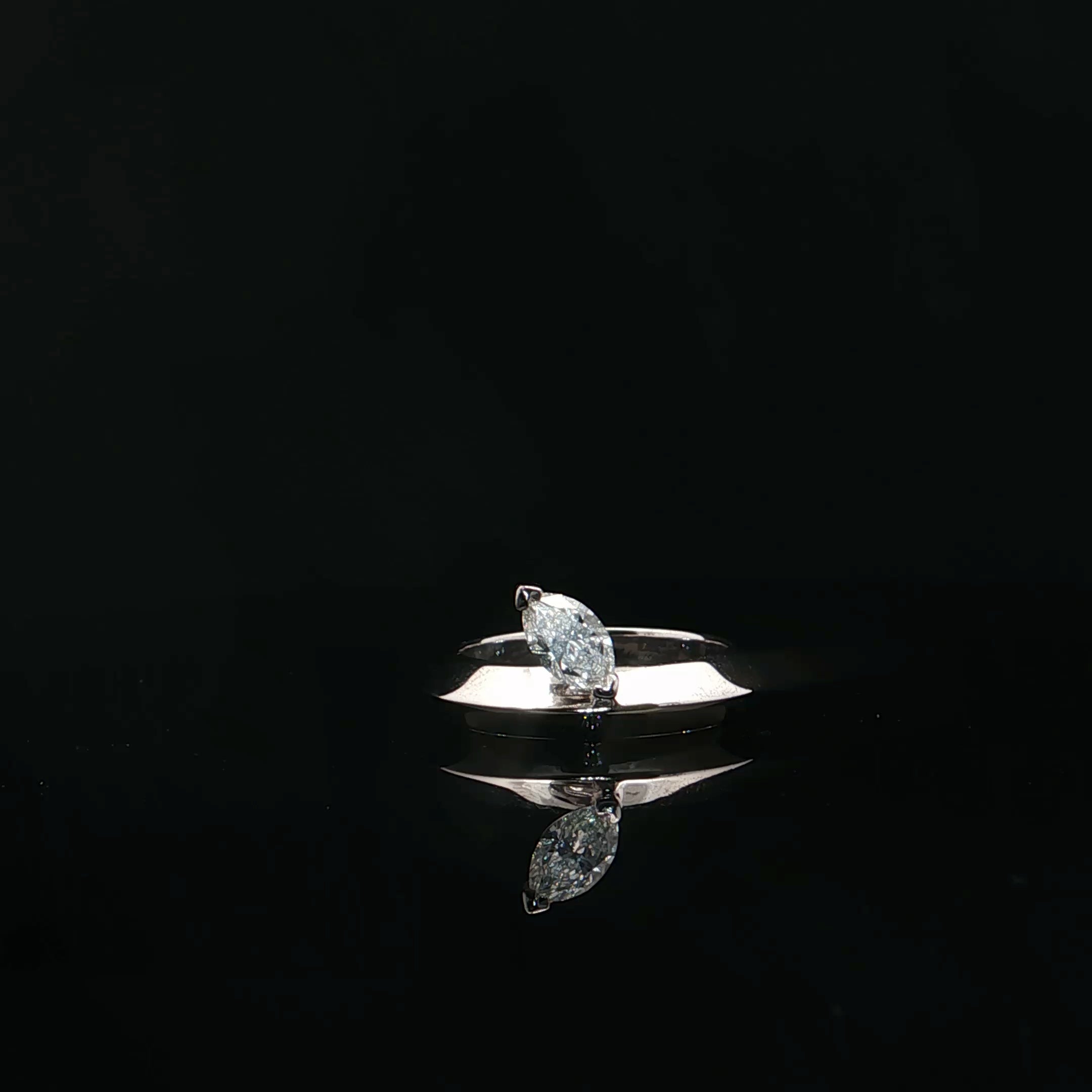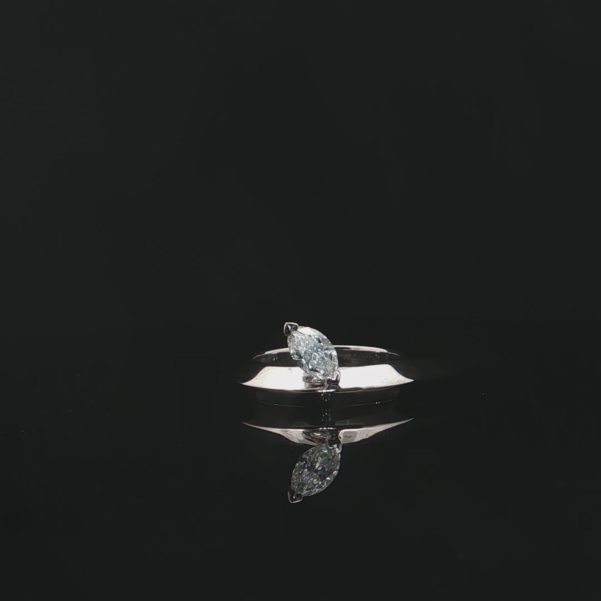 This ring is smooth, polished, and slightly curved, made of white gold metal. The most striking element is the setting of the marquise-cut diamond is positioned vertically, extending upward from the band.