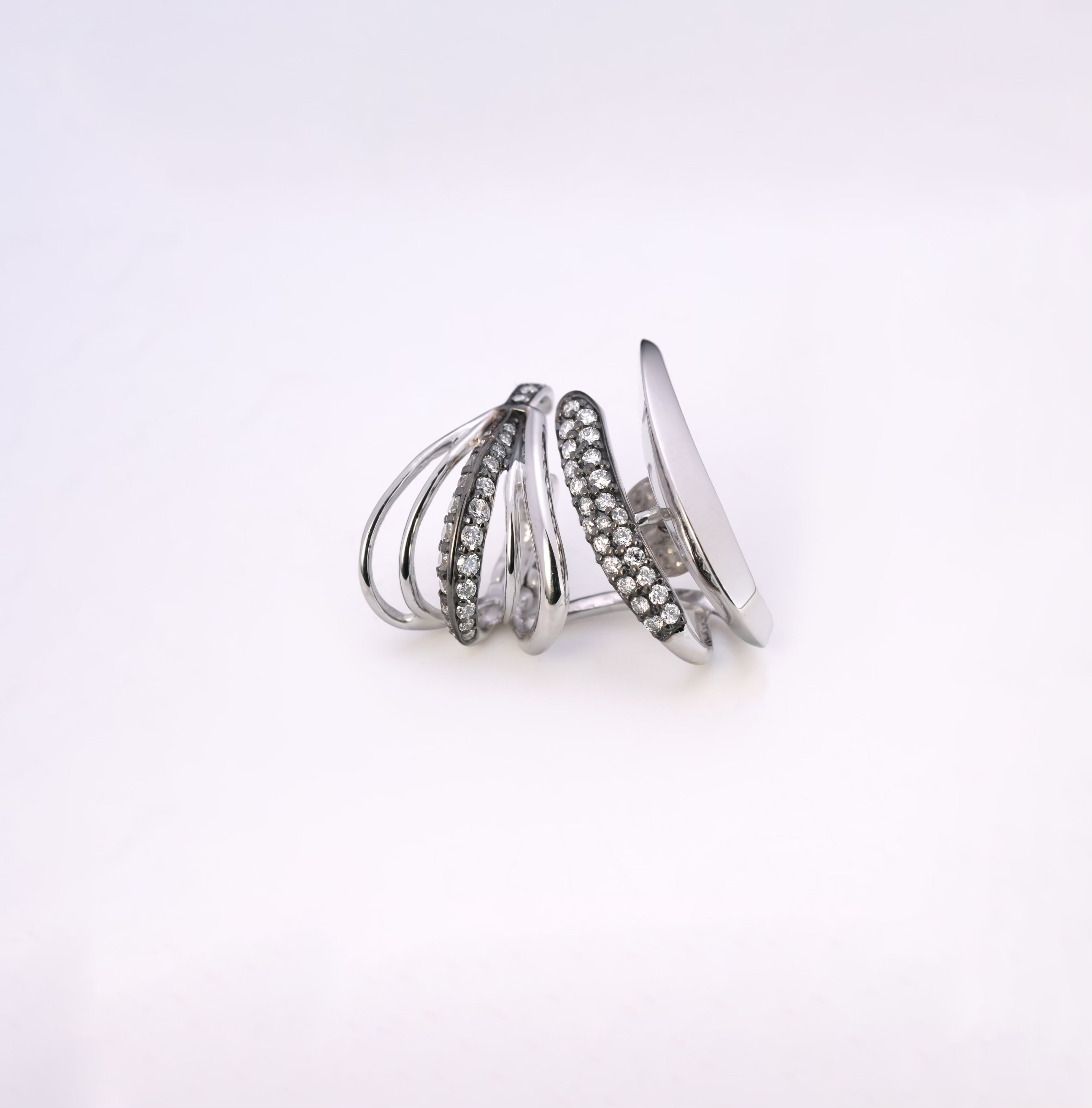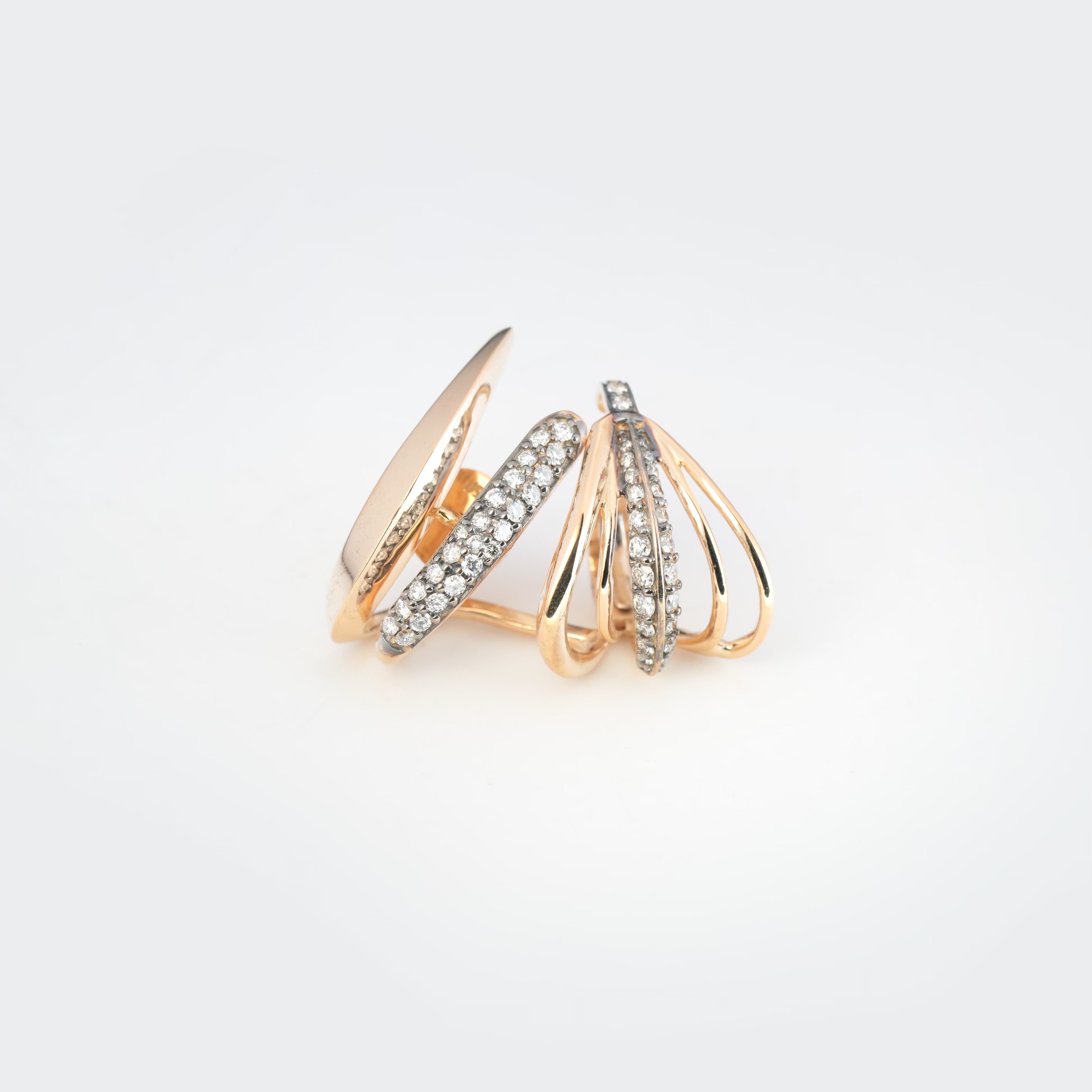 This statement earring features an architectural open-frame design with multiple overlapping arcs. Each arc alternates between high-polished gold and pavé-set white diamonds. The diamonds are precisely handset along the curved bands, enhancing the flowing silhouette with brilliance and depth.